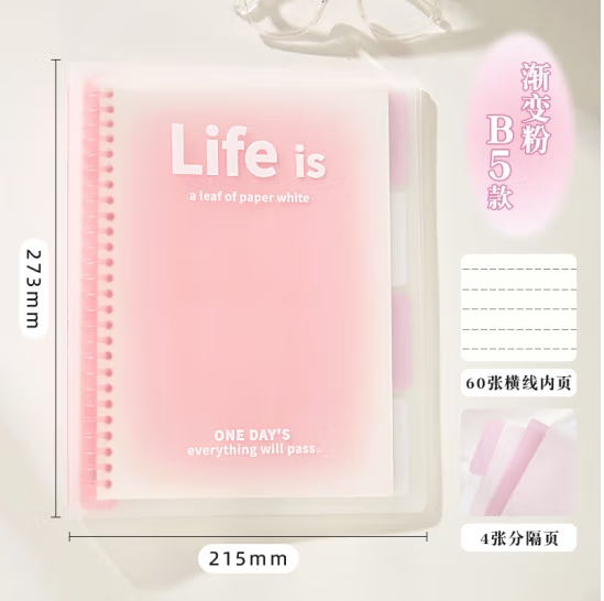 三年二班 1013466 薄本册 B5横线高颜值活页本笔记本可爱渐变色 渐变粉 单位:本